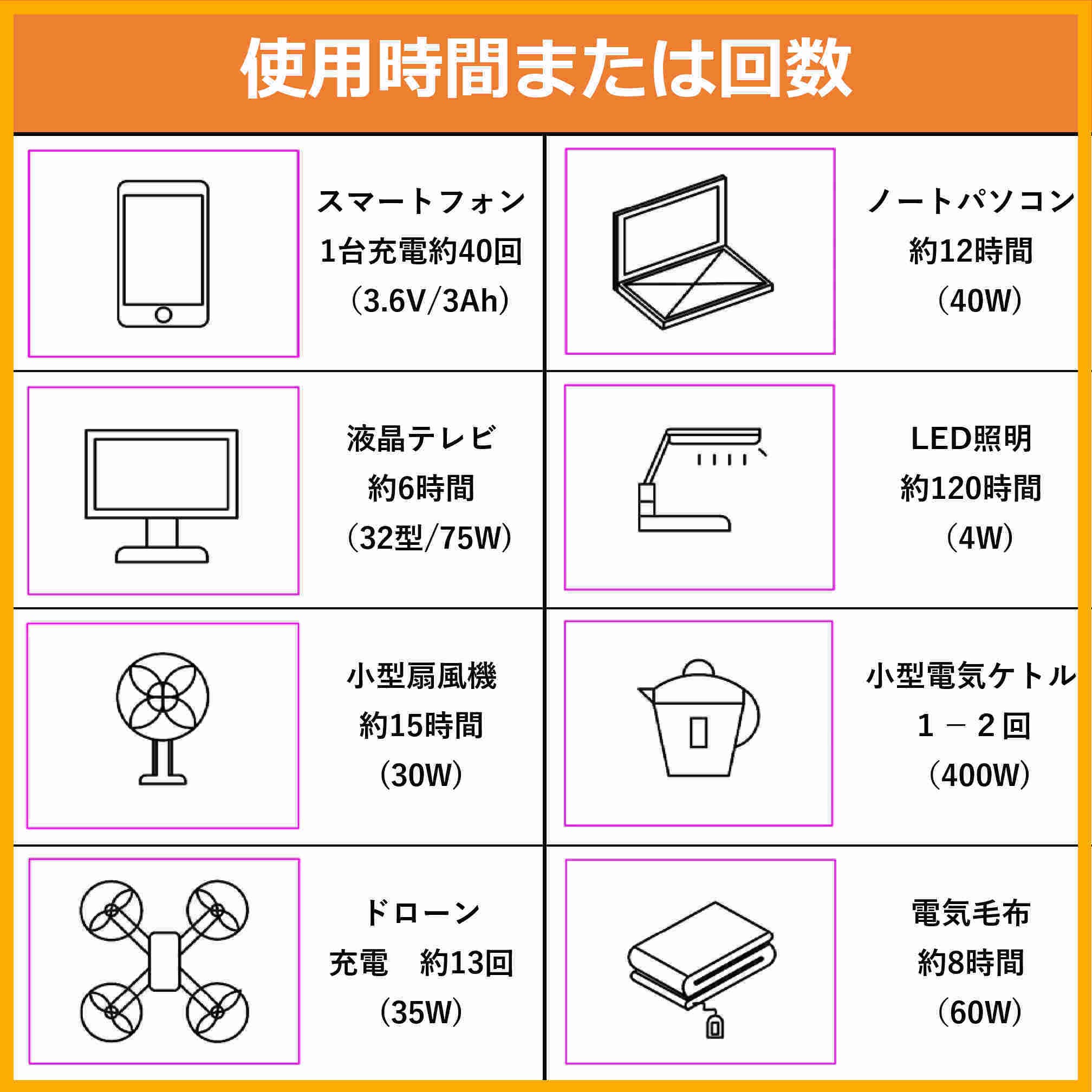 - 定格消費電力500W以下の機器であっても起動時に大きな電力を必要とする機器(冷蔵庫、モーター、ポンプ、掃除機など)は使用できない場合があります。
