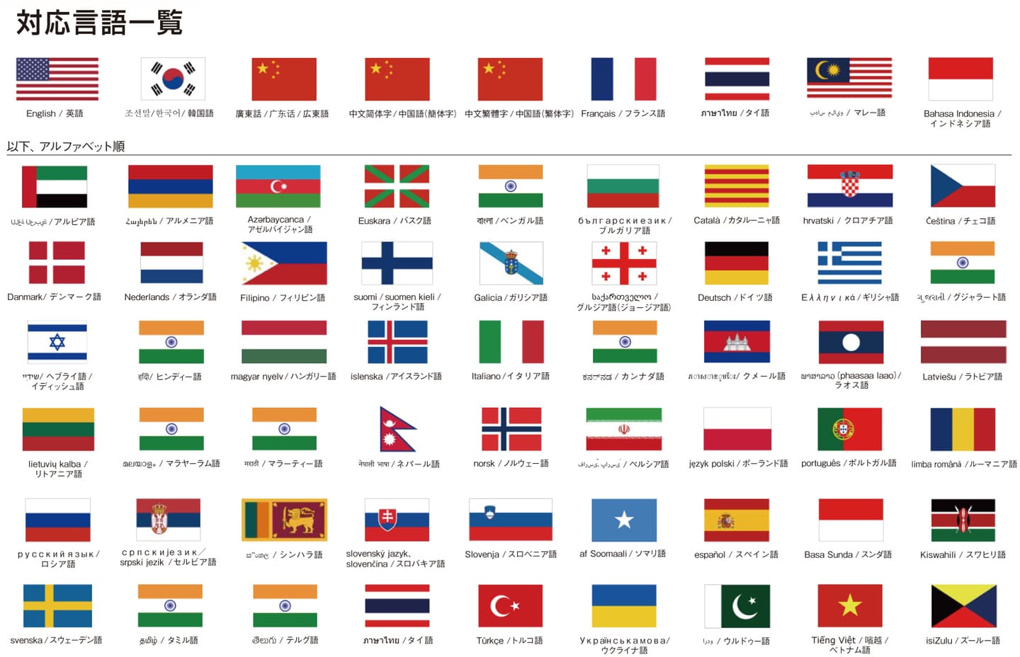 中国語(簡体字)・中国語(繁体字)・英語 (米国)・広東語・日本語・韓国語・ドイツ語・フランス語・ウルドゥー語・アルメニア語・ジャワ語 (インドネシア)・ウズベク語 (ウズベキスタン)・アラビア語(サウジ)・ポーランド語・フィリピン語(タガログ)・オランダ語・ラオ語(ラオス)・モンゴル語 (モンゴル)・ポルトガル語・スワヒリ語 (タンザニア)・ウクライナ語・イタリア語・ラトビア語・スロバキア語・アムハラ語・ボスニア語 (ボスニア・ヘルツェゴビナ)・フィンランド語・ガリシア語 (スペイン)・リトアニア語・ベンガル語・マケドニア語 (北マケドニア)・テルグ語 (インド)・ヘブライ語・ヒンディー語(インド)・パンジャブ語 (ゴルムチ、インド)・ノルウェー語・アゼルバイジャン語・ペルシア語・クメール語 (カンボジア)・カタルーニャ語・ルーマニア語・ビルマ語・スウェーデン語・タミル語(インド)・ギリシャ語・インドネシア語・ズールー語(南アフリカ)・マレー語・エストニア語 (エストニア)・デンマーク語・ジョージア語・チェコ語・マラーティー語 (インド)・アフリカーンス語 (南アフリカ)・セルビア語・タイ語・スペイン語・スロベニア語・ベトナム語・クロアチア語・バスク (スペイン)・アルバニア語 (アルバニア)・グジャラート語・カンナダ語(インド)・マラヤーラム語 (インド)・ネパール語・シンハラ語 (スリランカ)・トルコ語・ハンガリー語・アイスランド語・スンダ(インドネシア)・カザフ語 (カザフスタン)