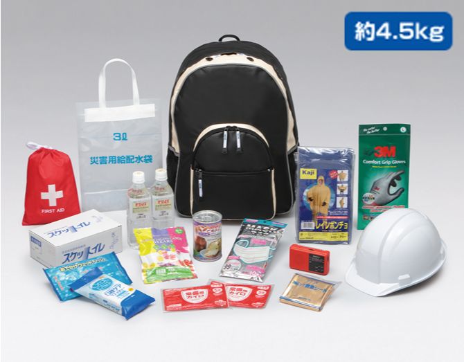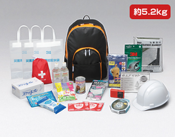 セコムオリジナル防災バッグ、防災用ヘルメット、手回し充電式ラジオライト、キャンディ(50g・1粒当たり19kcal)1袋、保存水(500mL) 2 本、ソフトパン( 100g・335kcal)1缶、サージカルマスク(10 枚入り)、口腔ケア用ウエットティッシュ( 30枚入)、雨具(ポンチョ)、汚物処理グッズ(10回分)、ウエットティッシュ、使い捨てカイロ (2袋)、救急セット、作業用グローブ、ポリタンク( 3L)1袋、防寒具( アルミック救急シート)